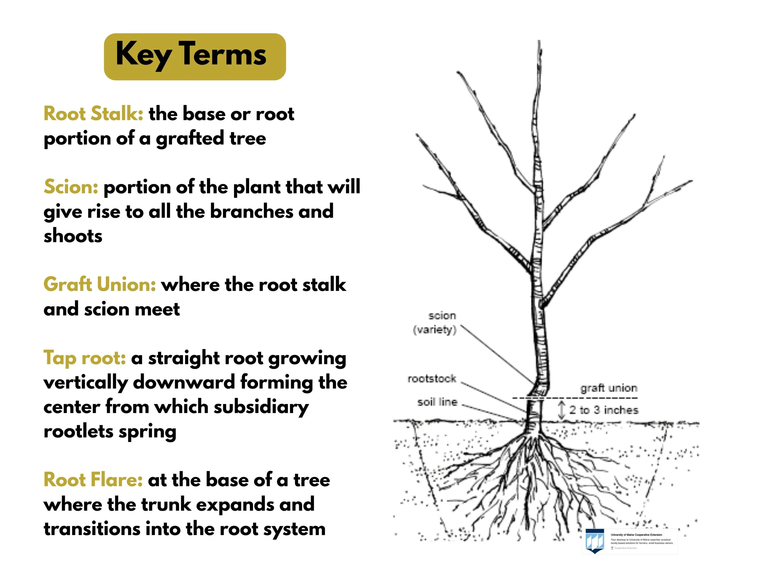 Where those two pieces meet is called the graft union, and it must remain visible above the soil line to protect the tree’s long-term health. Participants also learn to identify the root flare, the place where the trunk widens and transitions into the root system. Keeping this area exposed allows the tree to establish strong, healthy roots.