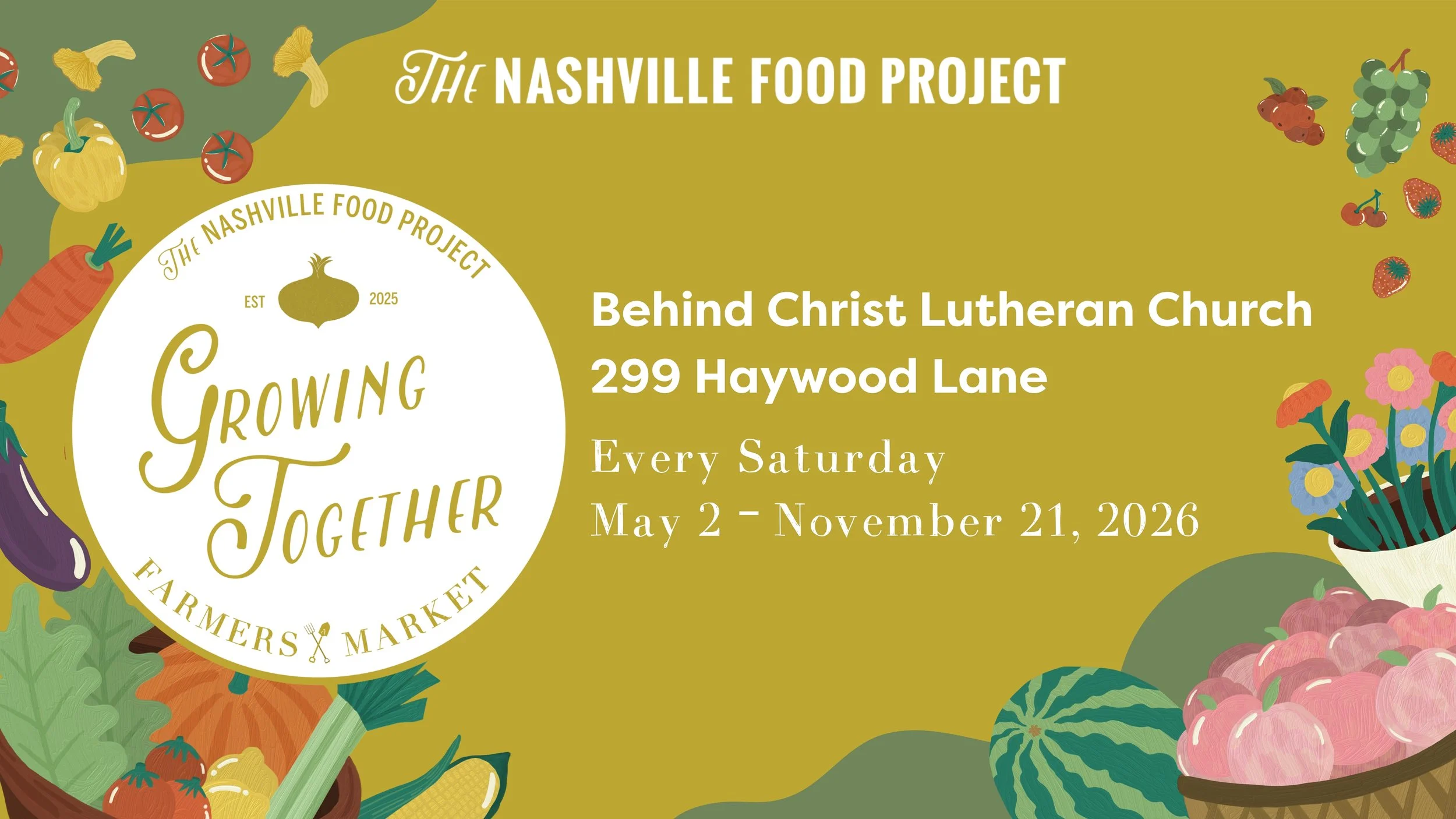 Join us every Saturday morning on the Growing Together farm, located behind Christ Lutheran Church at 299 Haywood Lane, 9am - 12pm, May 2 – November 21, 2026, to purchase fresh local produce grown by global farmers in the heart of South Nashville’s international corridor. The market also welcomes and features other growers, makers, and producers from around Nashville.